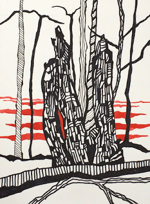 Recently I have been working mostly in black and white. It started with my pen and ink pieces. For those small pieces, a bit of orange or red behind the trees or creature was enough. The ink work told the story.